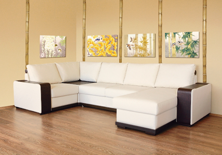 Каркас: хвойных пород древесины, березовая фанера, ЛДСП, ДВП. Механизм трансформации: угловой диван - «дельфин». Малый угол - сиденье, выдвижная подушка дивана и сиденье оттоманки. Наполнитель: поролон марки 25-45 различной толщины и синтепон. Сиденья - из формованного пенополиуретана высокой плотности. Подушки спинки - холофайбер. Комплектация: модульная система - позволяет составить мебель любой конфигурации. Габаритные размеры ,мм: 3560х1910х950 Спальное место, мм: 2200х1450