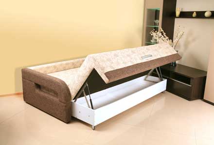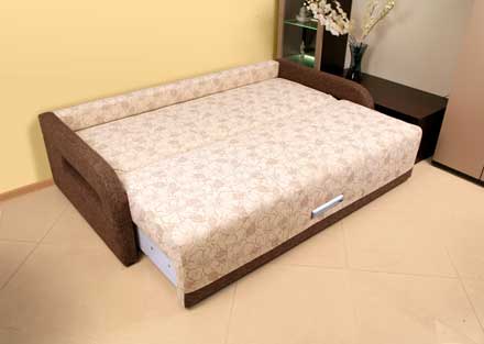 Данная модель имеет популярный и хорошо зарекомендовавший себя механизм трансформации - «еврокнижка». Испытание временем подтвердило надежность, простоту и легкость использования мебели с этим механизмом. Диван предназначен для повседневного использования, в разложенном положении образуется ровное спальное место. Каркас: выполнен из древисины хвойных пород, фанеры и ЛДСП. Диван-кровать имеет бельевой ящик, который снабжен специальным подъемным механизмом, что позволяет складывать белье, не отодвигая сидение. Наполнитель: элементы сиденья и спального места выполнены из высокоэластичного пенополиуретана с «пружинным блоком». Габаритные размеры: 220х110х90см. Спальное место: 200х145 см.