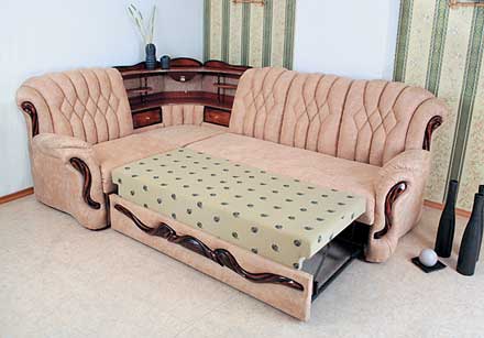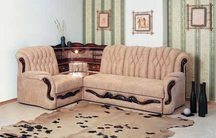 Угловой диван «Квин 5» Каркас: выполнен из хвойных пород дерева и фанеры. Наполнитель: элементы сиденья и спального места выполнены из высокоэластичного пенополиуретана с «пружинным блоком» в сочетании с пружиной «змейкой, подушки спинки – аналог пуха, экологический материал «Камфорель». Отличительные особенности: встроенный бар выполнен из ЛДСП с подсветкой, цвет орех, в угловом секторе – трансформируемый столик, кресло и кресельный элемент имеют вместительный бельевой ящик. Возможно исполнение этого дивана с мягким угловым сектором. Механизм трансформации: «Дельфин», легко раскладывается, с высоким удобным спальным местом. Комплектация: Угол с баром (Уб), Угол мягкий (без бара) (Ум), Кресло для отдыха (Кр). Габаритные размеры (мм): Угол 2700х920х1060 (спальное место 2070х1220), Кр 1000х920х1060.