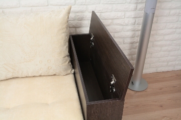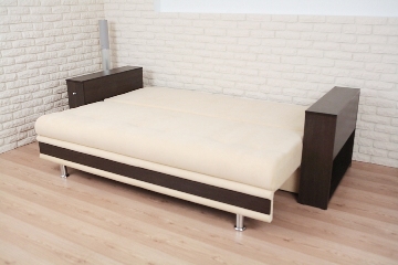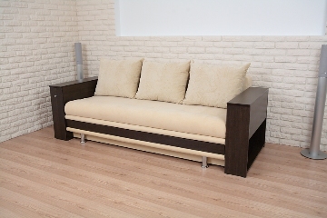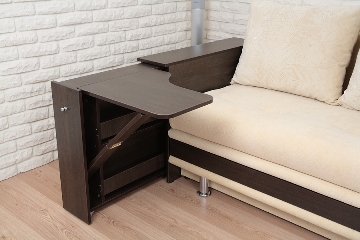 Подлокотники съёмные, выполнены из ЛДСП разных оттенков (дуб, вишня, орех, венге), один из подлокотников раскладывается, образуя столик. Наполнитель: Элементы сиденья и спального места выполнены из высокоэластичного пенополиуретана с «пружинным блоком», подушки спинки «пенополиуретановая крошка». Отличительные особенности: Диван-кровать имеет вместительный бельевой ящик из ЛДСП. Механизм трансформации: «Еврокнижка» Комплектация: Большой диван (БД) Габаритные размеры (мм): БД 2370х1000х1000 (сп.м.1950х1460)