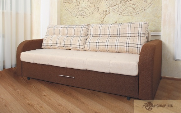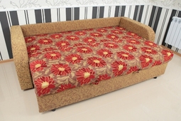 Каркас: выполнен из калиброванного бруса древесины хвойных пород, многослойной фанеры и ЛДСП. Наполнитель: спальное место выполнено из высокоэластичного пенополиуретана; в основании спального места использованы ортопедические латы. Мягкость и комфорт подушек спинки обеспечиваются наполнением пенополиуретановой крошкой. Механизм трансформации: "тик-так" ("шаговая" еврокнижка). Отличительные особенности: диван можно поставить на любую ровную поверхность пола ( независимо от покрытия): "шаговый" механизм обеспечивает безопасность и сохранность как паркета, так и напольного покрытия. Механизм содержит пружины и штангу-синхронизатор, которые облегчают раскладывание дивана и не дают перекашиваться сидению. Диван предназначен для повседневного исполтзования, имеет вместительные секции для белья. Для предотвращения контакта со стеной во время сна предусмотрена задняя спинка. Комплектация: Большой диван (БД) Габаритные размеры (мм): 2230х950х600 (сп.м. 1960х1380).
