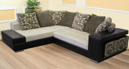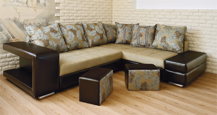 Каркас: выполнен из древесины хвойных пород и фанеры лиственных пород, ЛДСП и ЛДВП. В основании сидячего и спального места ортопедические латы. Угловой диван-кровать имеет два бельевых ящика из ЛДСП. Элементы угловой модели соединяются с помощью зацепов и болтов. Все части дивана съёмные. Сверху на малом подлокотнике – полка из ЛДСП. В нишу большого подлокотника встроены два пуфа.
