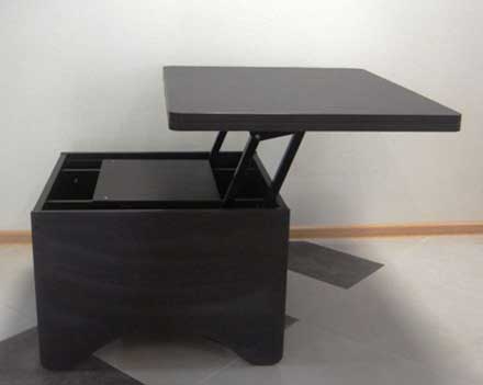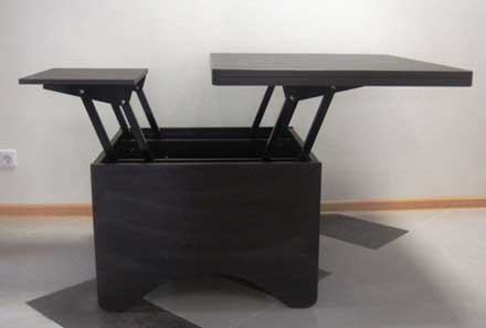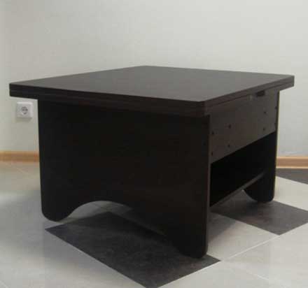 Эта модель стола-трансформера красива и многофункциональна. Новизну модели придаёт возможность трансформации столешницы с помощью подъёмно-поворотного механизма. Это позволяет увеличивать столешницу как в высоту на 260 мм, так и в длину в два раза, превращая тем самым журнальный стол в обеденный. Двухуровневая столешница выполнена из ЛДСП толщиной 22 мм, края столешницы закруглены. Под столешницей специальная полка для хранения газет, журналов и других полезных мелочей. Журнальный стол имеет эргономичный дизайн и прекрасно впишется в современный интерьер. Кроме того, стол имеет доступную цену, по сравнению с подобными моделями, представленными на российском рынке. Модель выполнена в цвете венге.