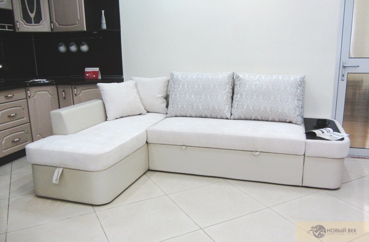 Каркас: древесина хвойных пород, многослойная фанера, ЛДСП. Наполнитель: основание сиденья - пенополиуретан, синтепон. Подушки спинки - пенополиуретан, гипоаллергенный пух "камфорель". Механизм трансформации: "дельфин". Комплектация: угловой диван.